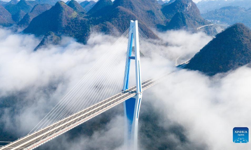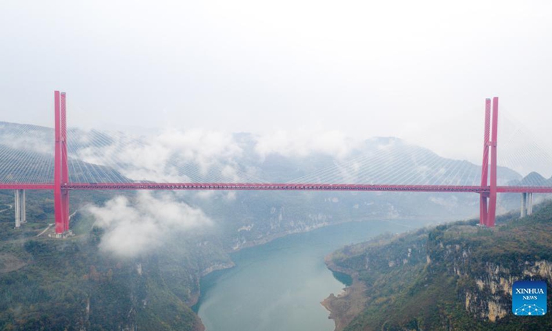 Aerial photo taken on Nov. 25, 2021 shows the Pingtang Bridge, a major connection on the Pingtang-Luodian Expressway, in southwest China's Guizhou Province. Guizhou, with 92.5 percent of its area covered by mountains and hills, has built over 20,000 bridges since late 1970s.(Photo: Xinhua)