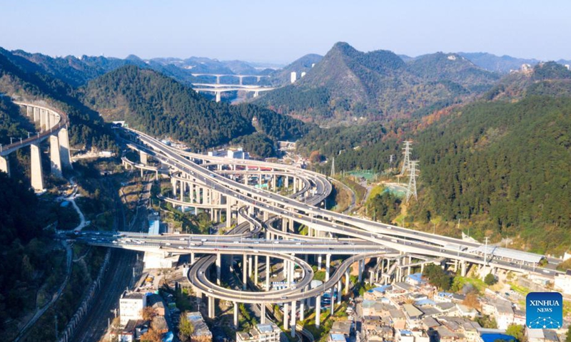 Aerial photo taken on Nov. 30, 2021 shows Qianchun Overpass in Guiyang, southwest China's Guizhou Province. Guizhou, with 92.5 percent of its area covered by mountains and hills, has built over 20,000 bridges since late 1970s.(Photo: Xinhua)