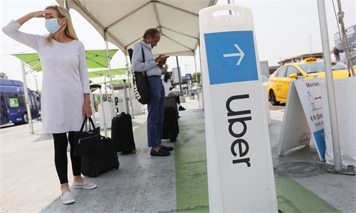 Air travelers wait in the ride share lot near a sign for Uber at Los Angeles International Airport on August 20 in Los Angeles, California. Photo: AFP