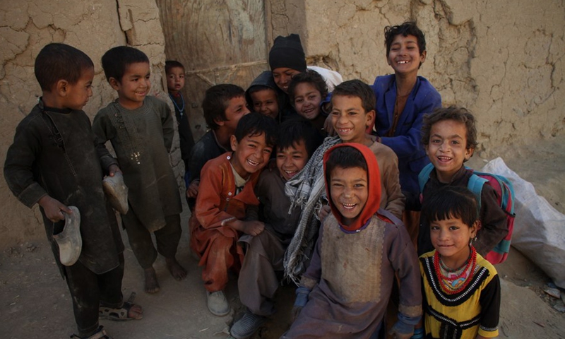 Afghan children pose for photos at an internally displaced persons (IDPs) camp in Kabul, capital of Afghanistan, Nov. 20, 2021.Photo:Xinhua