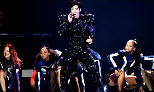 Singer Leehom Wang (Front) performs during his tour concert held at Taipei Arena in Taipei, southeast China's Taiwan, June 8, 2019. (Photo: Xinhua)