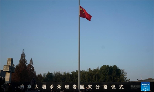 China's national flag flies at half mast ahead of the national memorial ceremony for the Nanjing Massacre victims at the Memorial Hall of the Victims of the Nanjing Massacre by Japanese Invaders in Nanjing, capital of east China's Jiangsu Province, Dec. 13, 2021.Photo:Xinhua