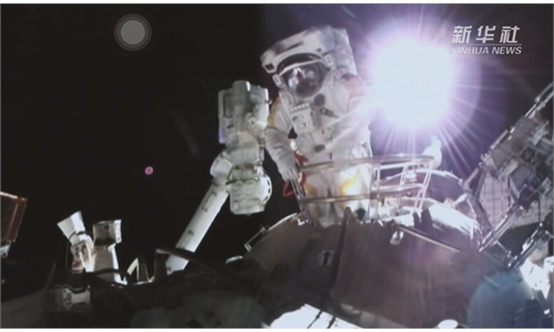 Shenzhou-13 taikonaut Ye Guangfu opened the cabin and came out for the crew's 2nd spacewalk mission. Photo: CCTV