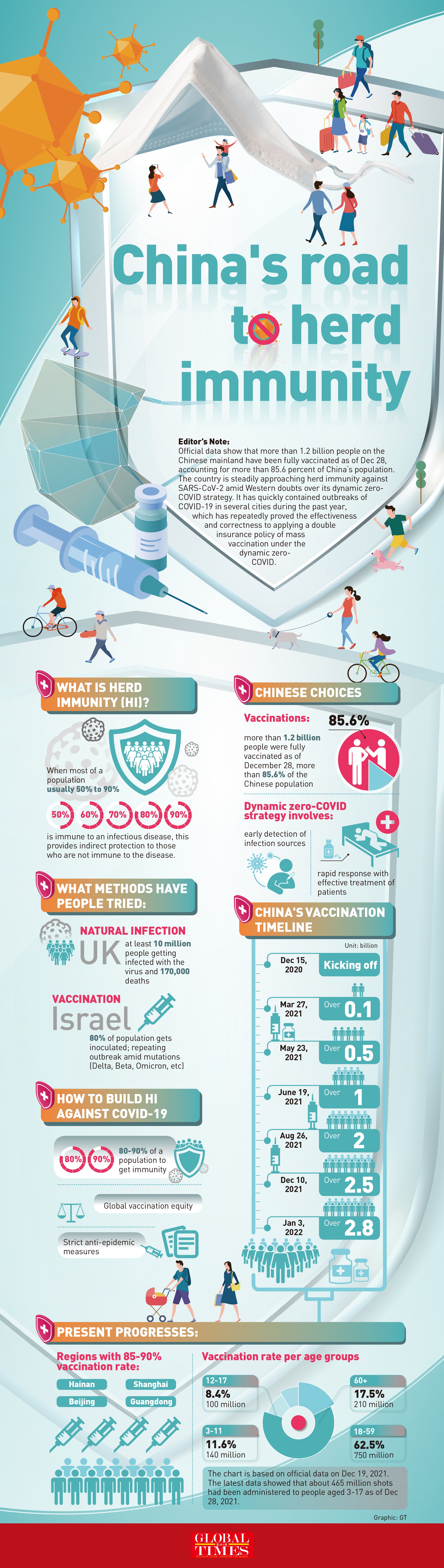 Official data show that more than 1.2 billion people on the Chinese mainland have been fully vaccinated as of Dec 28, accounting for more than 85.6 percent of China's population. The country is steadily approaching herd immunity against SARS-CoV-2 amid Western doubts over its dynamic zero-COVID strategy. It has quickly contained outbreaks of COVID-19 in several cities during the past year which has repeatedly proved the effectiveness and correctness to applying a double insurance policy of mass vaccination under the dynamic zero-COVID.