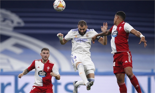 Karim Benzema of Real Madrid scores his team's first goal against Valencia on January 8, 2022 in Madrid, Spain. Photo: VCG