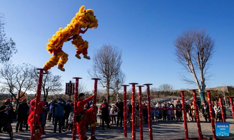 Tourists watch lion dance performance during the New Year holiday at Penglai Pavilion scenic area of Yantai, east China's Shandong Province, Jan. 2, 2022.Photo:Xinhua