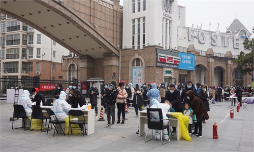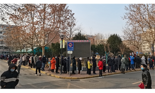 Residents of Heping district in North China's Tianjin take nucleic acid tests at a local elementary school sports ground on January 10, 2022. Photo: VCG
