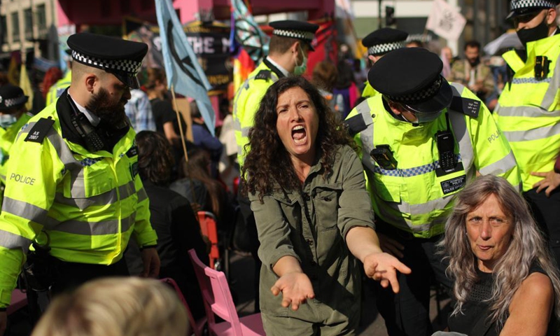 Demonstrators take part in the climate campaign group Extinction Rebellion protest near Leicester Square in London, Britain, on Aug. 23, 2021. (Photo by Tim Ireland/Xinhua)