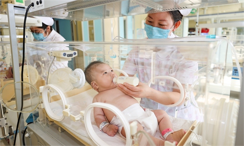 A nurse holds a new born baby in a hospital in Zhengzhou, Henan Province on January 1, 2022. Photo: VCG
