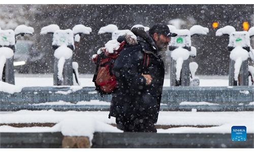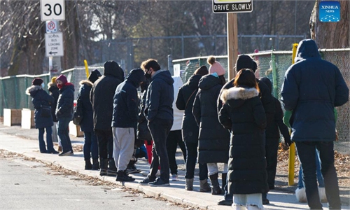 People with a thick coats line up to enter a COVID-19 vaccination clinic in Toronto, Canada, on Jan. 3, 2022. The City of Toronto issued an extreme cold weather alert on Monday.(Photo: Xinhua)