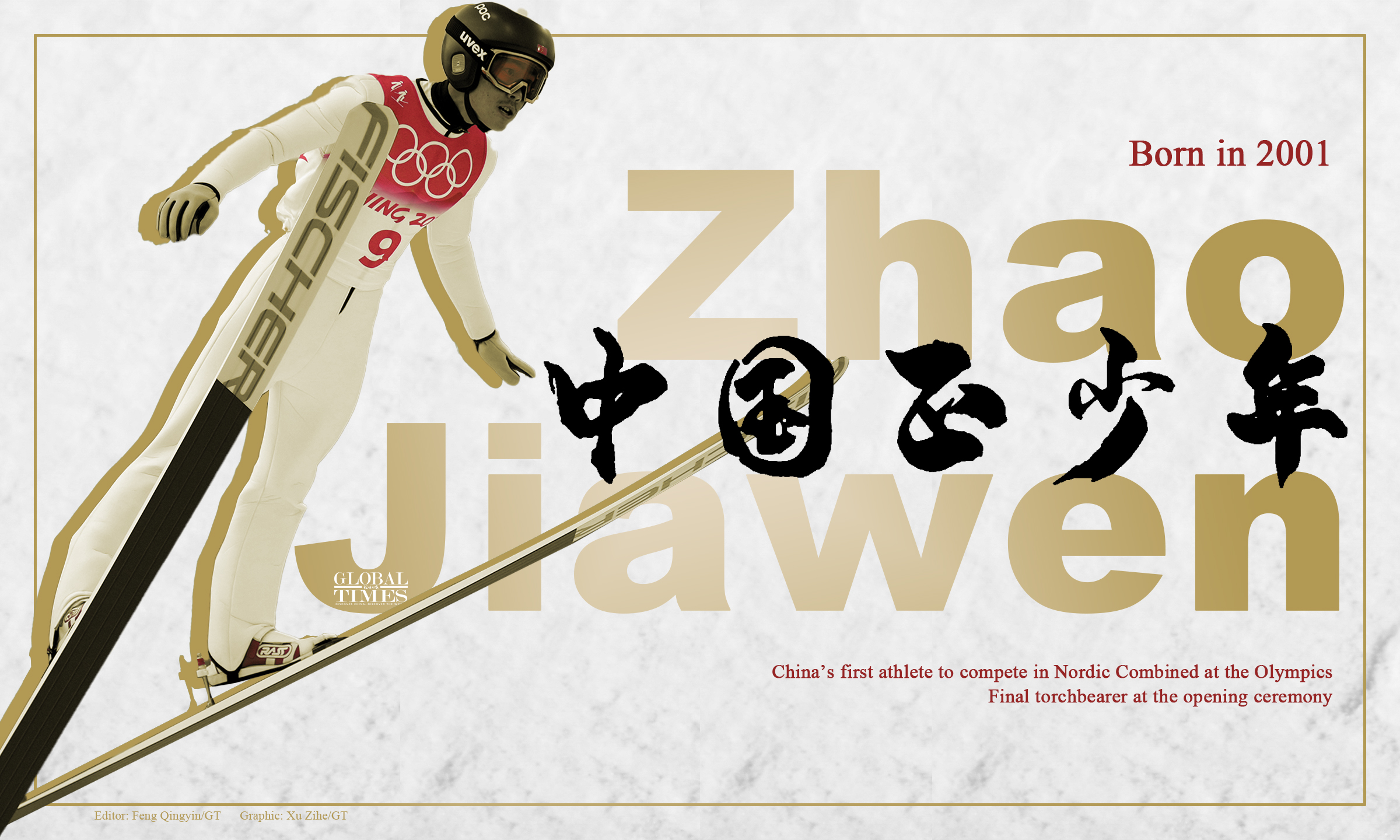 From zero to one, 21-year-old Zhao Jiawen, makes history and becomes the 1st Chinese athlete to compete in Nordic Combined at the Olympics. He is also the final torchbearer at the opening ceremony. Graphic: Xu Zihe/GT