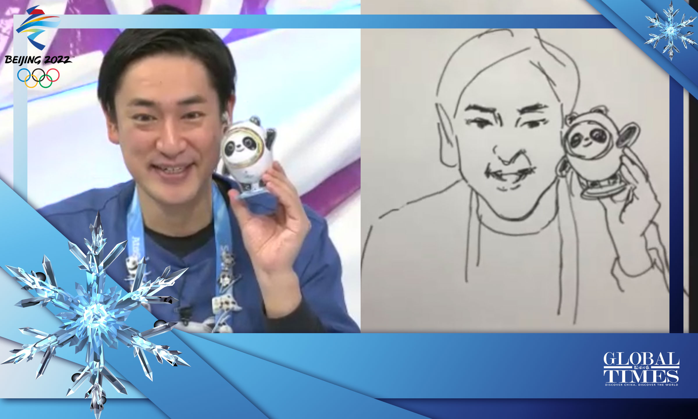 "I am so excited!" The super Japanese fan of Bing Dwen Dwen, the panda-shaped mascot of the Beijing 2022 Winter Olympic Games, Gido Tsujioka, got a special gift from Cao Xue, head of the Beijing 2022 mascot design team, a cartoon of himself and Bing Dwen Dwen during his online talk with Cao on Tuesday.