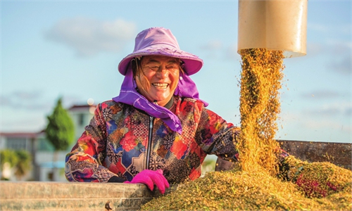 Several high-clearance plant protection machines shuttle back and forth in the fields to manage wheat in Suqian, East China's Jiangsu Province on February 10, 2022. The machines are spraying pesticides intensively to control pests as wheat grows faster when spring comes. Photo: cnsphoto