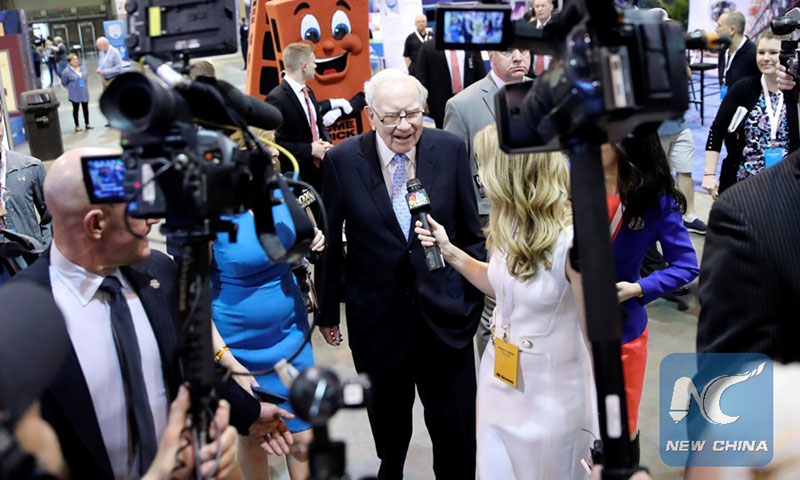 Warren Buffett, chairman and CEO of Berkshire Hathaway, visits the exhibition on his invested companies before the 2018 Berkshire Hathaway Annual Shareholders Meeting in Omaha, Nebraska, the United States, May 5, 2018. Photo:Xinhua