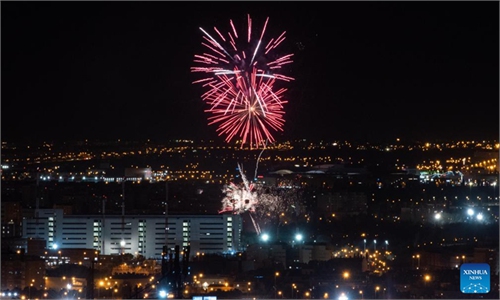 Over 1,000 illuminated drones display the pattern of a torch in the night sky above the West Lake to welcome the 200-day countdown to the 19th Asia Games in Hangzhou, capital city of east China's Zhejiang Province, Feb. 21,2022. (Photo: China News Service/Wang Gang)