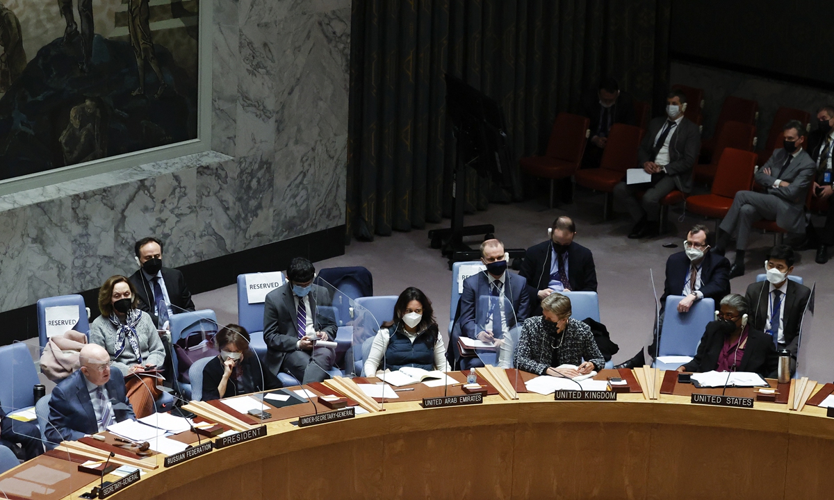 The United Nations Security Council holds an emergency meeting on the Ukraine crisis at its headquarters in New York on February 21, 2022. In a statement, UN Secretary-General Antonio Guterres called for the peaceful settlement of the conflict in eastern Ukraine, in accordance with the Minsk Agreements, as endorsed by the Security Council in resolution 2202 (2015). Photo: VCG