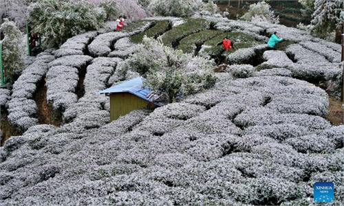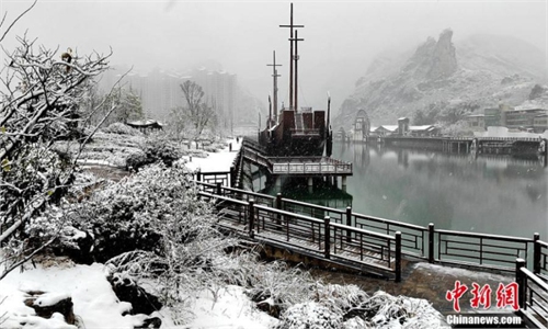 Photo taken on Feb.22, 2022 shows the Danxia landform on the upper reach of Yellow River in Jainca County, Huangnan Tibetan Autonomous Prefecture, Qinghai Province. (Photo: China News Service/Zhang Tianfu)