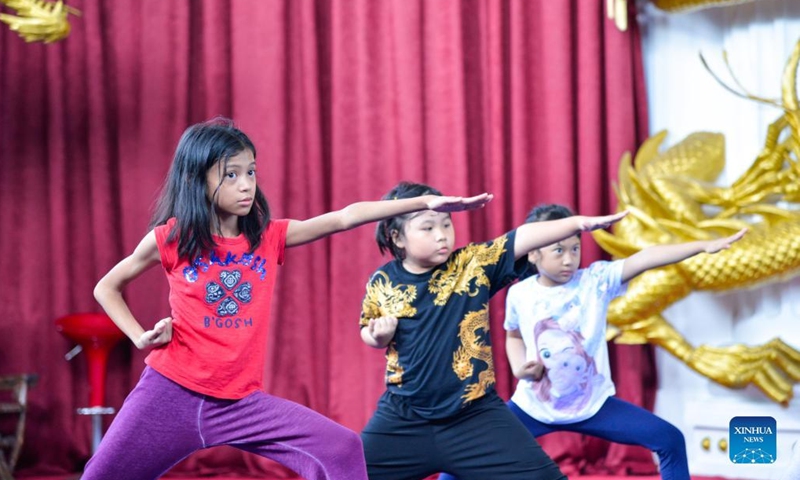 Children practice Chinese martial arts at Harmony Wushu Indonesia in Bogor, Indonesia, March 5, 2022.Photo:Xinhua