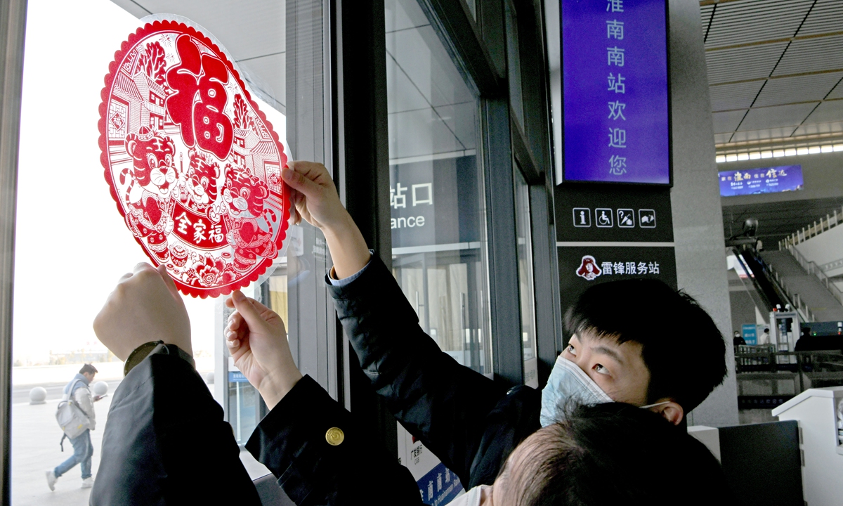 Workers stick paper-cut on the glass of a rail station's waiting hall to welcome the Spring Festival in 2022. Photo: VCG