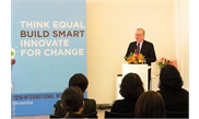 Staff members (front) apply colored powder to a rangoli (traditional floor decoration) reading "happy women's day" outside a restaurant in New Delhi, India on March 8, 2022, on the occasion of International Women's Day. 2022's theme is about gender equality today for a sustainable tomorrow. Photo: AFP