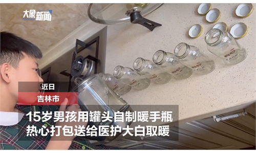 A 15-year-old boy in Jilin, Northeast China's Jilin Province, made hand-warming bottles from cans and sent it to ...