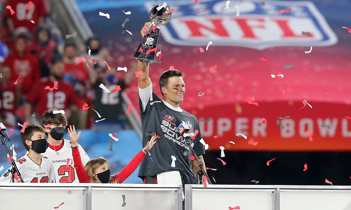 Super Bowl MVP Tom Brady of the Buccaneers hoists the Lombardi Trophy after the Super Bowl LV game between the Kansas City Chiefs and the Tampa Bay Buccaneers on February 7, 2021 in Tampa, Florida. Photo: VCG