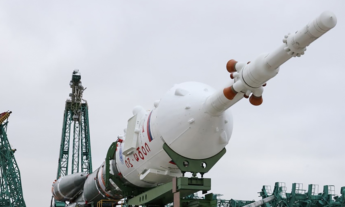 A Soyuz-2.1a rocket booster with the Soyuz MS-21 manned spaceship is being installed on a launch pad at the Russian-leased Baikonur cosmodrome in Kazakhstan on March 15, 2022. Russian cosmonauts Oleg Artemyev, Denis Matveev and Sergei Korsakov are scheduled to travel to the International Space Station aboard the Soyuz MS-21 spacecraft on March 18. Photo: VCG