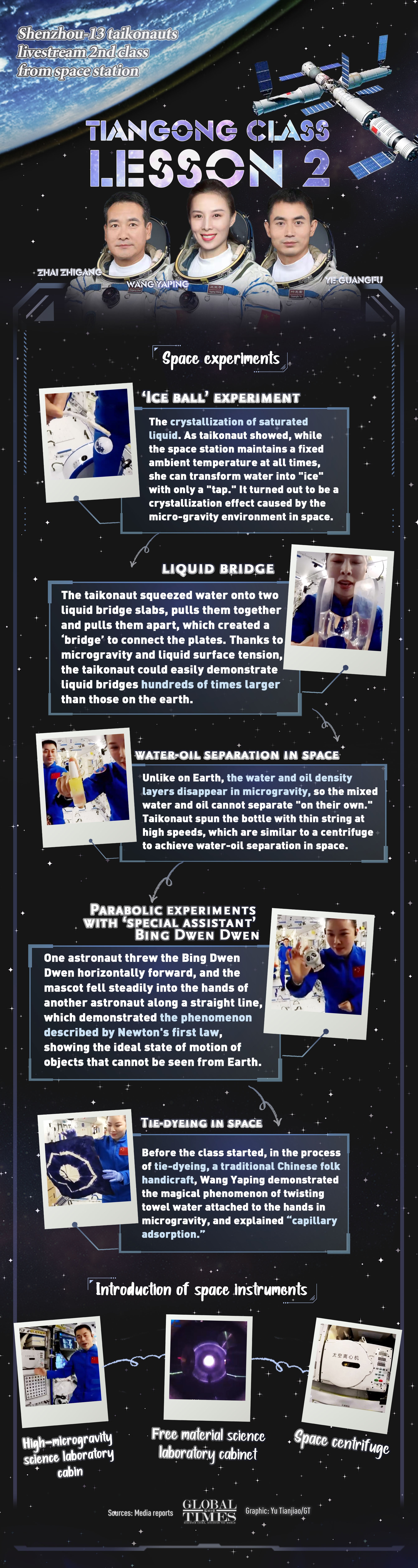 -BingDwenDwen somersaults to demonstrate parabolic experiment -Transform water into "ice ball" with only a "tap" Check out Shenzhou-13 taikonauts' 2nd live session of Tiangong classroom series, which inspires youngsters' dreams.
