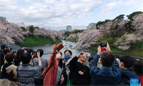 People walk along a pedestrian crossing surrounded by blooming cherry blossoms in Tokyo on March 31, 2022. Cherry blossoms, or "sakura," are Japan's favorite flower and usually reach their peak from late March to early April, just as the country celebrates the start of a new school and business year. Photo: VCG