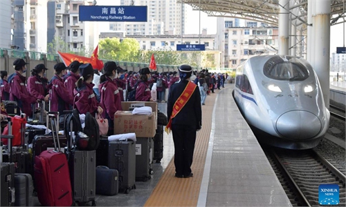 Medical workers are seen before setting out for Shanghai at Nanchang Railway Station in Nanchang, east China's Jiangxi Province, April 3, 2022. A team of medical workers left Jiangxi Province Sunday for Shanghai to help aid the COVID-19 control efforts there. Photo: Xinhua