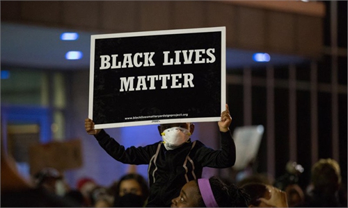 A demonstrator holds up an image of George Floyd following the sentencing of former Minneapolis police officer Derek Chauvin outside Hennepin County Government Center in Minneapolis, Minnesota, on Friday. Chauvin was sentenced to 22 years and six months in prison for murdering Floyd, a videotaped killing that triggered the most profound racial upheaval in the US since the civil rights era. Photo: VCG