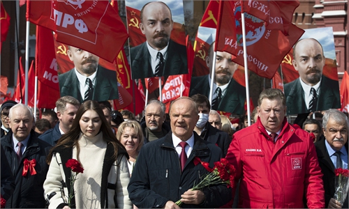 Russian Communist Party leader Gennady Zyuganov, center, and communist supporters hold their flags and portraits of Vladimir Lenin ...