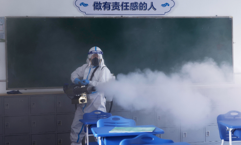 A volunteer disinfects a classroom in a middle school in Pudong New Area, Shanghai on April 21, 2022. Photo: VCG