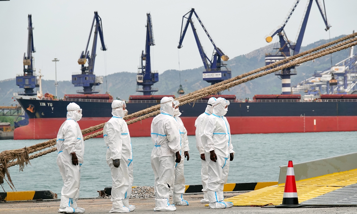 Dockers wear protective clothing at a port in Yantai, East China's Shandong Province, on April 25, 2022. Photo: VCG
