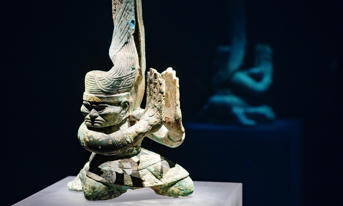 A statue in a kneeling position with its head turned is on display at the Sichuan Museum in Chengdu, capital of Southwest China's Sichuan Province, on September 28, 2021. Photo: VCG