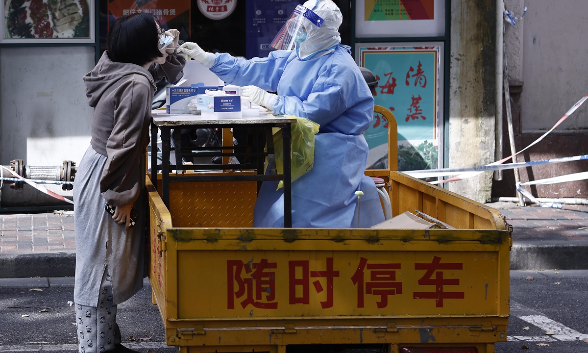 A woman takes the nucleic acid test in Shanghai on April 4, 2022 Photo: VCG