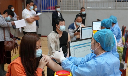 A staff member at the vaccination site told the Global Times that the volunteer did not show any physical discomfort after receiving the shot.