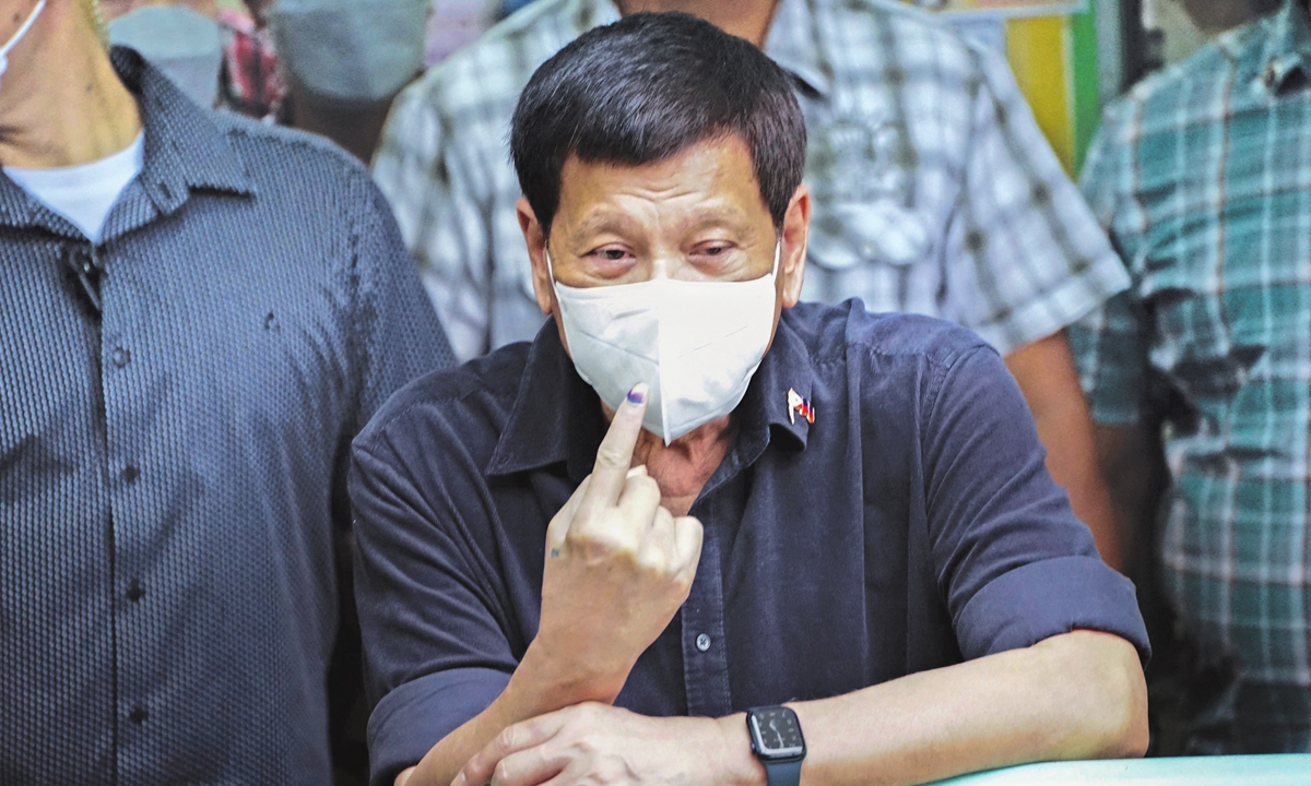 Philippine President Rodrigo Duterte displays indelible ink on his finger after casting his ballot in the presidential election at a polling precinct in Davao City, on the southern island of Mindanao on May 9, 2022. Photo: VCG
