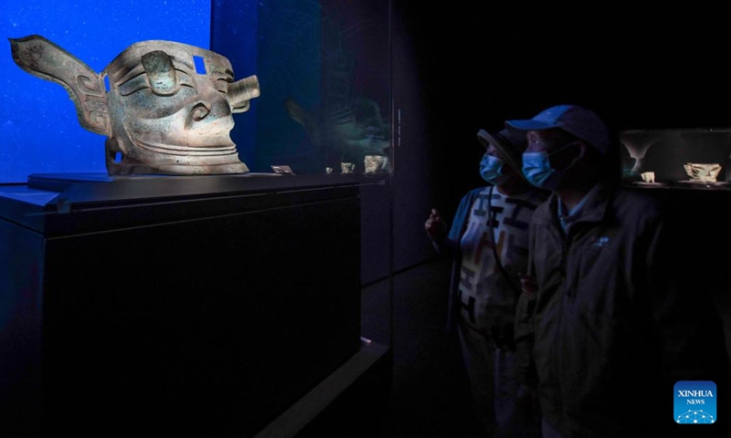 People visit the Sanxingdui Museum in Guanghan, southwest China's Sichuan Province, May 16, 2022. In recent years, important archaeological discoveries from Sanxingdui Ruins site have driven the boom of the designing and sales of cultural and creative products in the Sanxingdui Museum.Products based on excavated cultural relics are popular among visiting tourists.(Photo: Xinhua)