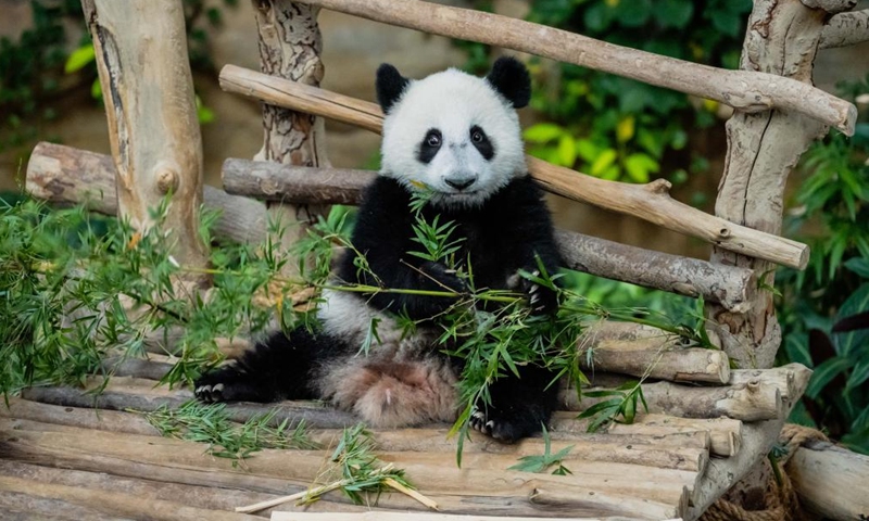Giant panda cub Sheng Yi enjoys bamboo at Zoo Negara near Kuala Lumpur, Malaysia, May 25, 2022. The third locally bred giant panda cub born in May last year in Malaysia is officially named Sheng Yi, which means "peaceful and friendship."The name also indicates the wish of the Malaysian government in strengthening its diplomatic ties with China, according to a press release by Minister of Energy and Natural Resources of Malaysia Takiyuddin Hassan.(Photo: Xinhua)