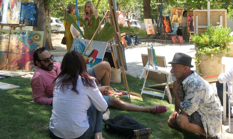 Artists chat with each other in the town of Sidi Bou Said in Tunis, Tunisia, June 12, 2022.Photo:Xinhua