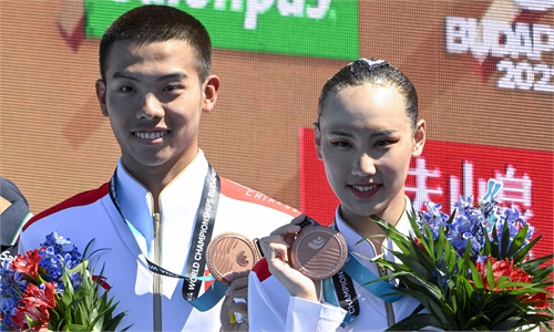 Gold medal winners Cao Yuan (left) and Wang Zongyuan pose during the medal ceremony in Budapest, Hungary, on June 26, 2022. Photo: VCG