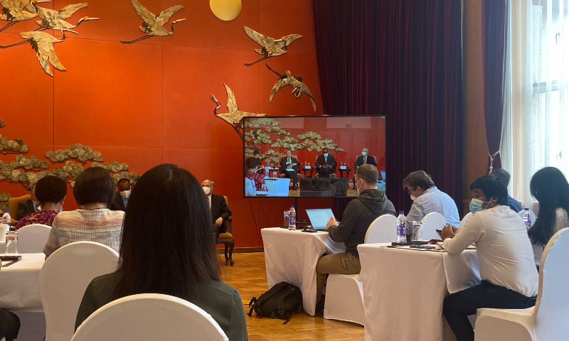 Diplomats, experts and journalists participate in a teleconference on the BRICS on Monday in Beijing. Photo: Xie Wenting/GT