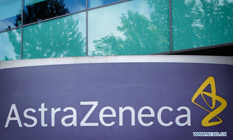Photo taken on May 18, 2020 shows a logo in front of AstraZeneca's building in Luton, Britain. (Photo by Tim Ireland/Xinhua)