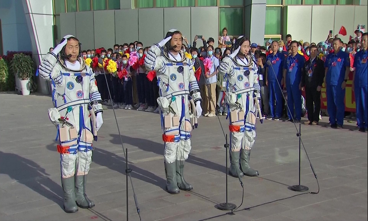 The crew members of Shenzhou-14 salute to people before their launch on June 5, 2022. Photo: VCG