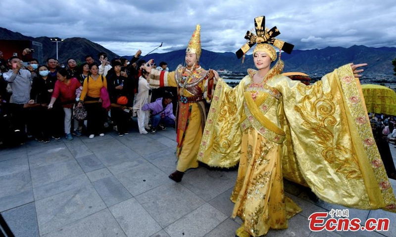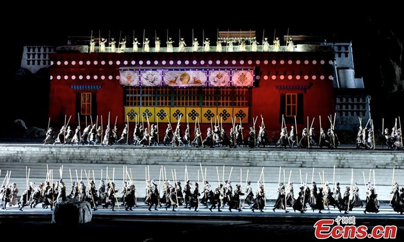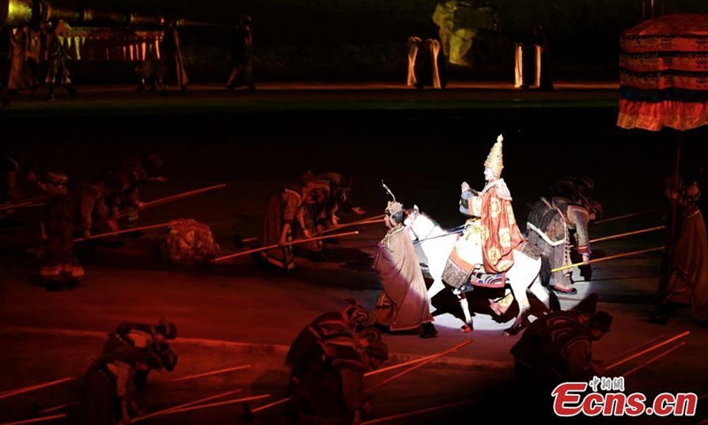 The opera "Princess Wencheng" is staged in Lhasa, capital of southwest China's Tibet Autonomous Region, Aug 1, 2022. The outdoor opera based on the life of a Tang Dynasty (618-907) princess was staged to celebrate its 10th anniversary. The opera tells the story of Princess Wencheng, who came all the way from Chang'an to marry Tibetan King Songtsen Gampo over 1,300 years ago. It has been performed more than 1,600 times, attracting more than 4 million tourists since its premiere in 2013. (Photo: China News Service/Li Lin)