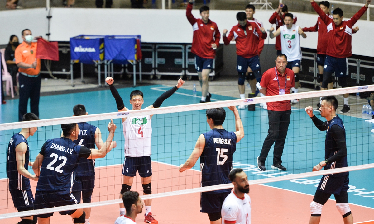 Players of China celebrate during the 2022 Asian Volleyball Confederation Cup match between China and Bahrain in Nakhon Pathom, Thailand on August 9, 2022. Photo: Xinhua