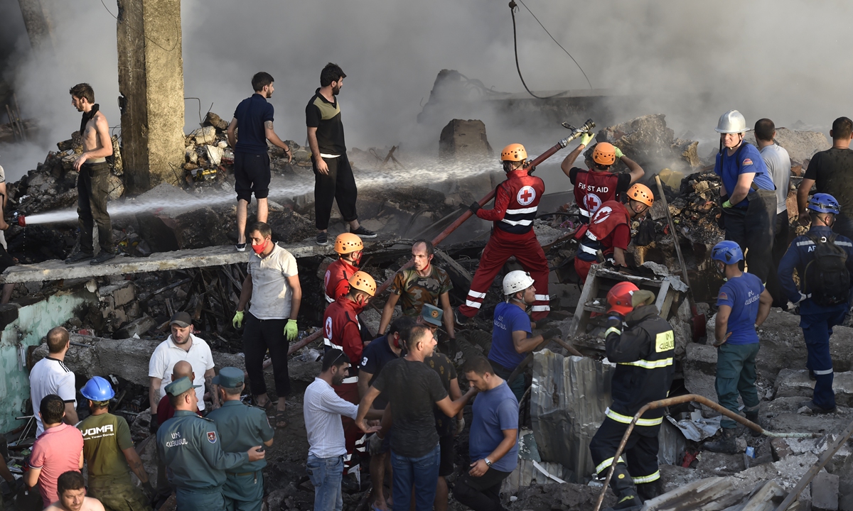 Residents and rescue workers clear the rubble at the scene of an explosion at the Surmalu market, which specializes in the wholesale of various goods and products, in Yerevan, Armenia, on August 14, 2022. Photo: VCG