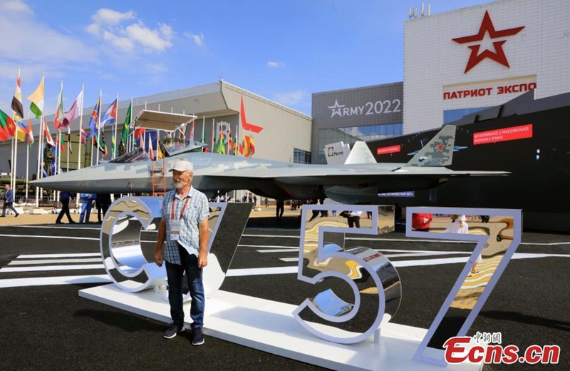 A Su-57 fighter jet is on display during the International Military and Technical Forum 2022 in Moscow, Russia, Aug. 15, 2022. (Photo: China News Service/Tian Bing)