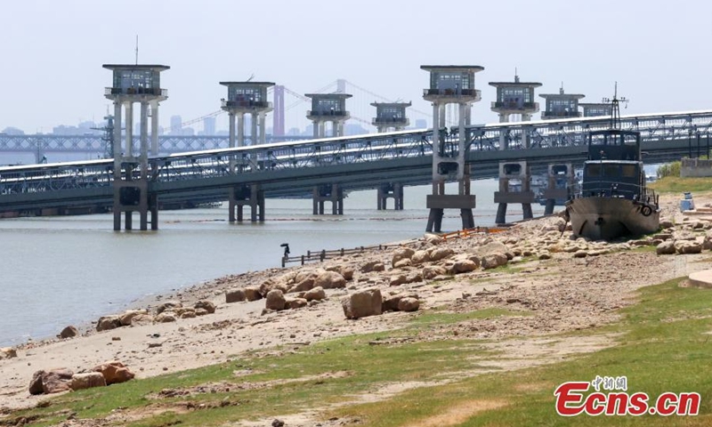 Water levels in the Yangtze River that flows through Southwest China's Chongqing Municipality have declined due to a prolonged drought, revealing parts of the river bed, on August 17, 2022. Photo: VCG